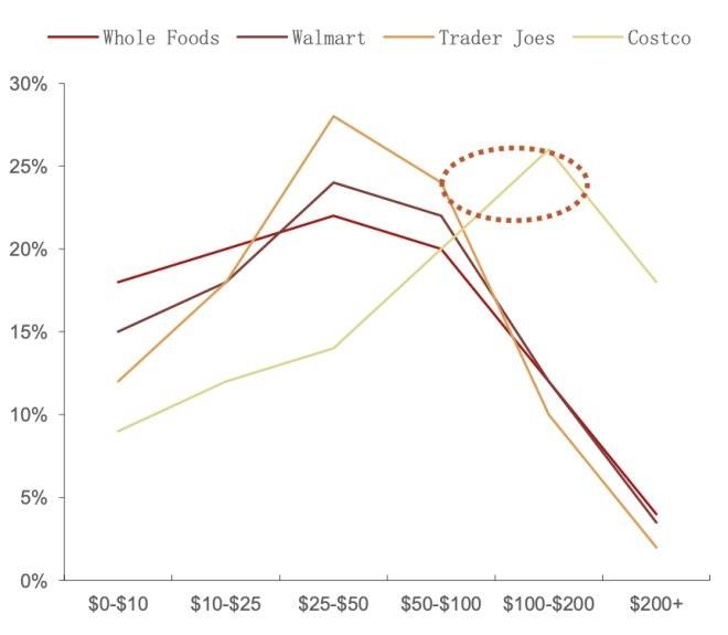 Costco目標(biāo)客群為美國年收入8-10萬美元、Top30%的家庭,在Costco消費(fèi)的客單價遠(yuǎn)高于其他競爭對手。