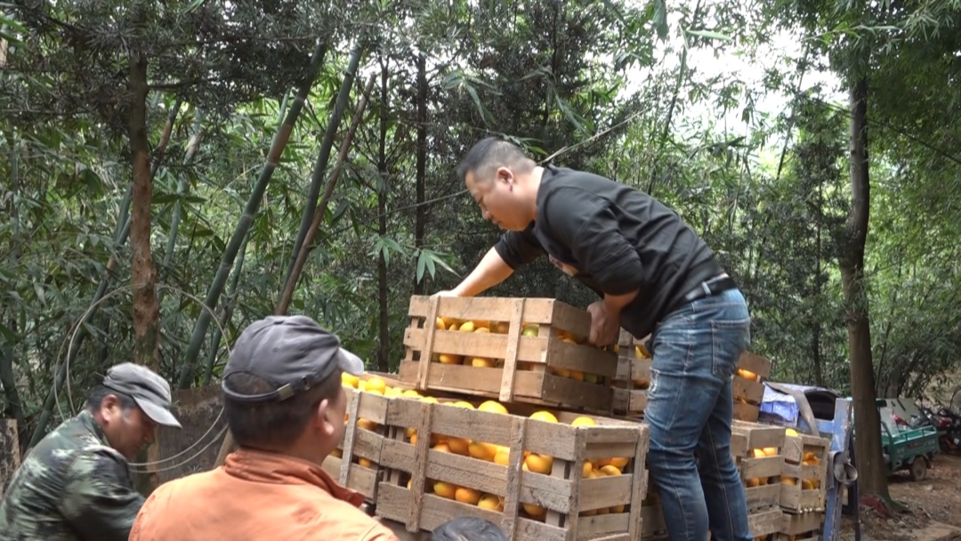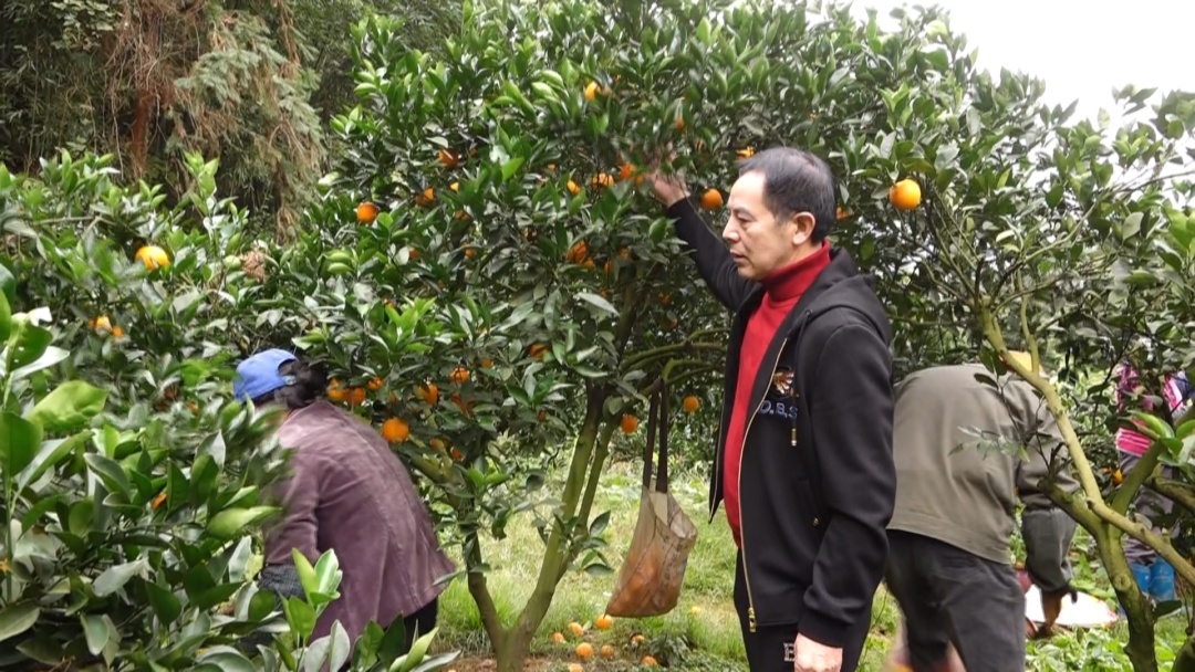 果園里橙香四溢,黃澄澄的臍橙掛滿枝頭,工人們嫻熟的將臍橙摘下。果樹(shù)下,幫助朱招弟與永輝牽線搭橋的愛(ài)心人士游厚壽也來(lái)看望朱招弟一家。